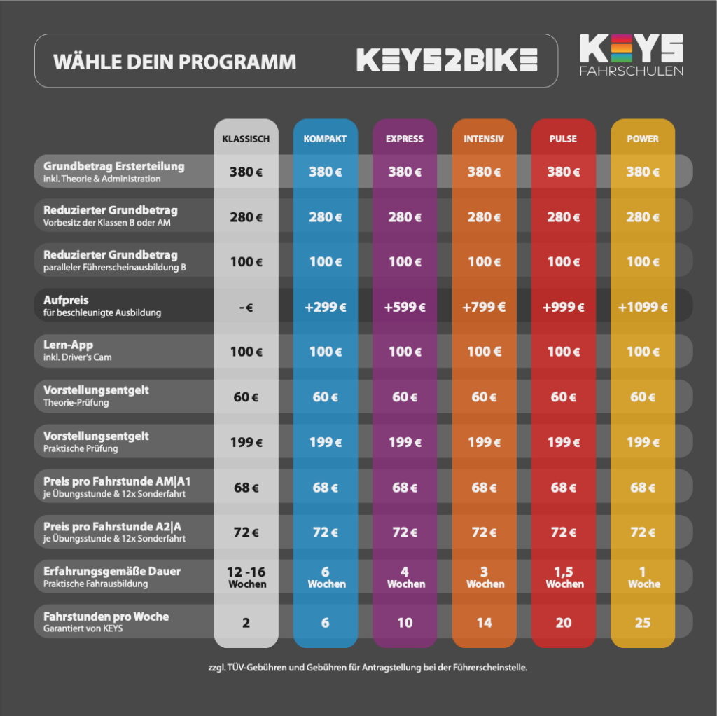 TÜV-Gebühren sowie Gebühren für die Antragsstellung bei der Führerscheinstelle sind nicht enthalten.